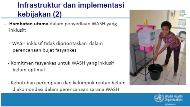 Availability, accessibility, acceptability and quality of water sanitation and hygiene (WASH) services in healthcare facilities is critical to improve patient safety and quality of care. The Ministry of Health, with support from WHO, is currently developing a national roadmap for WASH in Community Health Centers (Peta Jalan Air, Sanitasi, Higiene, & Pengelolaan Limbah di Puskesmas Tahun 2021-2030) to further that objective. There are seven strategic objectives in the roadmap which relate to policy and regulation, human resources for quality services, research and development, facility and infrastructure, community engagement, resilience and sustainability and monitoring-evaluation. The national roadmap will integrate gender equality and social inclusion aspects to address the specific WASH needs of women and vulnerable population, prevent stigma and discrimination, and ensure that no one is left behind in access to WASH in healthcare facilities.