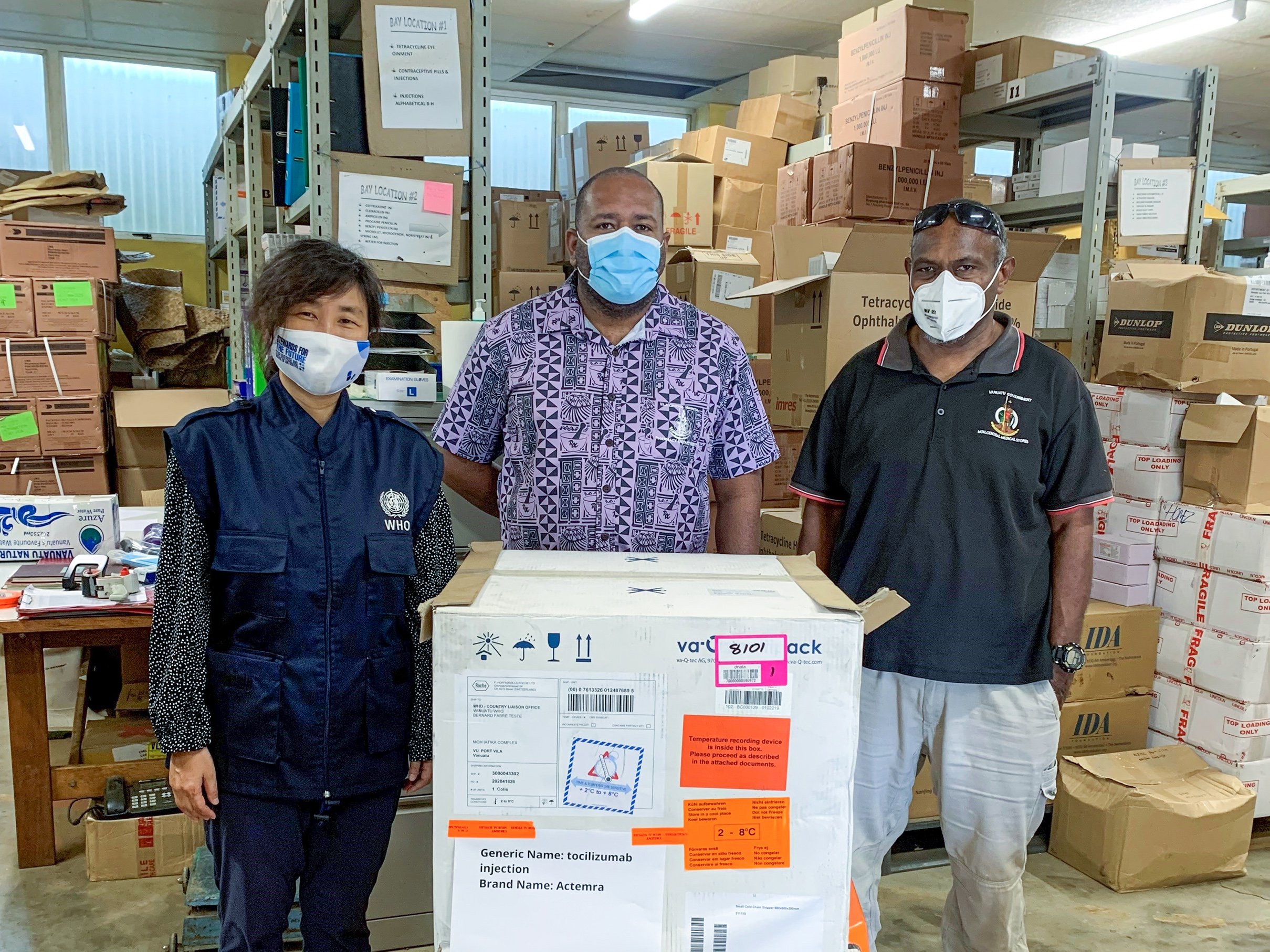 WHO Vanuatu Country Liaison Officer Dr Eunyoung Ko hands over 16,000 units of tocilizumab to the Ministry of Health. Photo: WHO
